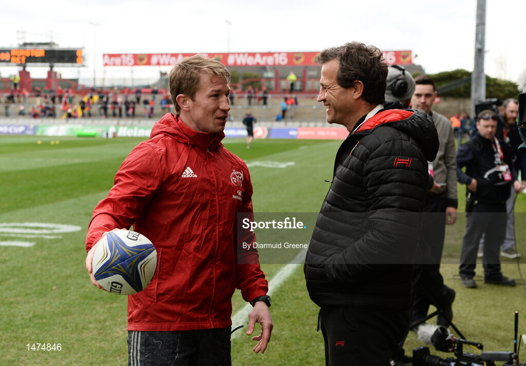 31 March 2018; Munster forwards coach Jerry Flannery in conversation with RC Toulon head coach Fabien Galthié prior to the European Rugby Champions Cup quarter-final match between Munster and RC Toulon at Thomond Park in Limerick. Photo by Diarmuid Greene/Sportsfile