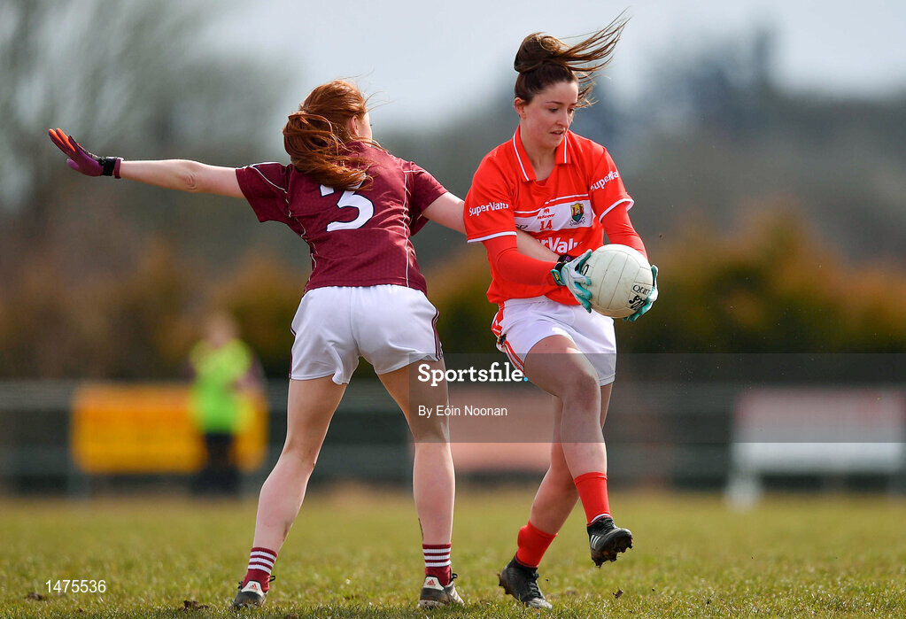 1 April 2018; Eimear Scally of Cork in action against Sarah Lynch of Galway during the Lidl Ladies Football National League Division 1 Round 7 match between Galway and Cork at Clonberne GAA Pitch in Ballinasloe, Co Galway. Photo by Eóin Noonan/Sportsfile