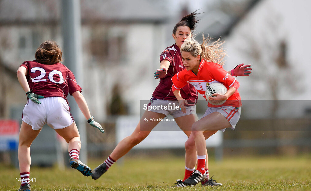 1 April 2018; Orla Finn of Cork in action against Charlotte Cooney of Galway during the Lidl Ladies Football National League Division 1 Round 7 match between Galway and Cork at Clonberne GAA Pitch in Ballinasloe, Co Galway. Photo by Eóin Noonan/Sportsfile