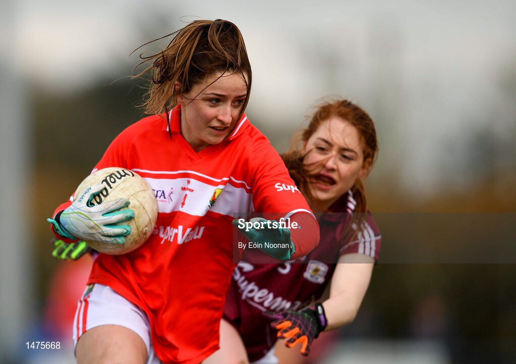 1 April 2018; Eimear Scally of Cork in action against Lisa Gannon of Galway during the Lidl Ladies Football National League Division 1 Round 7 match between Galway and Cork at Clonberne GAA Pitch in Ballinasloe, Co Galway. Photo by Eóin Noonan/Sportsfile