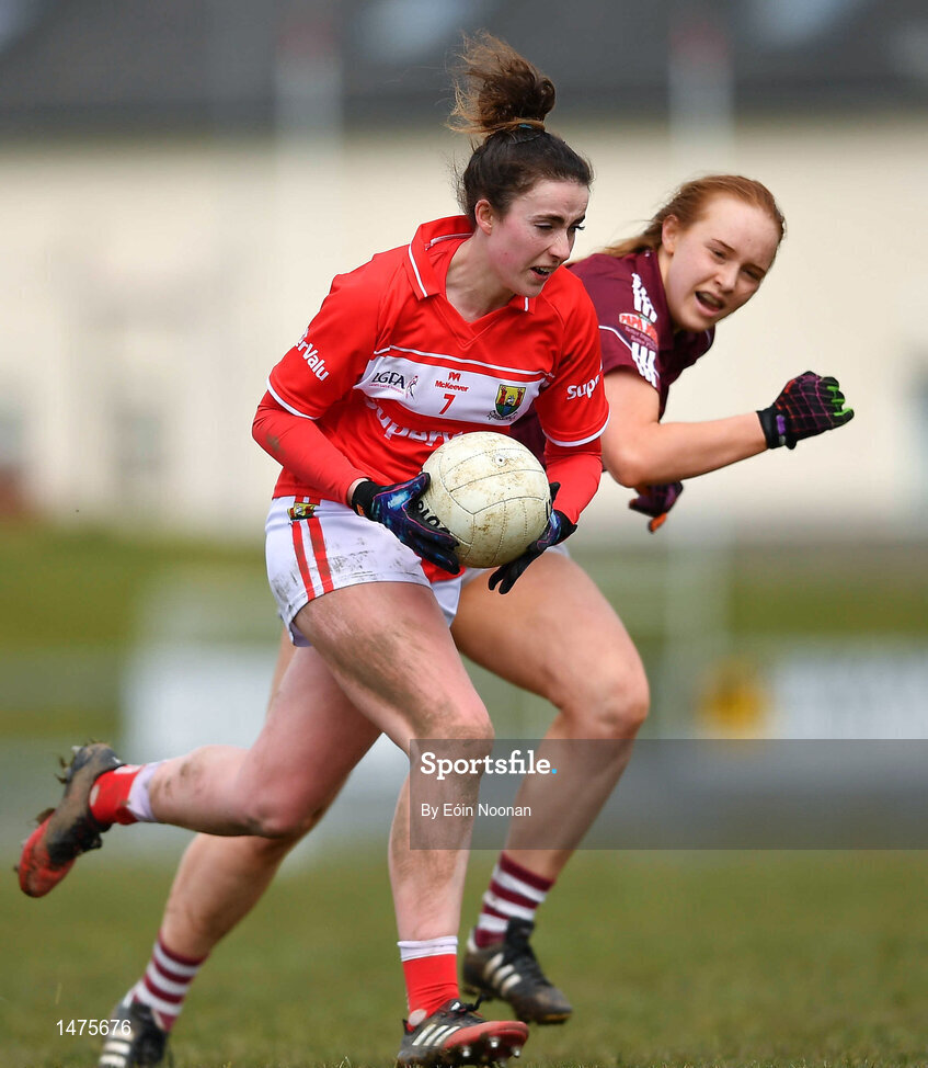 1 April 2018; Shauna Kelly of Cork in action against Siobhan Divilly of Galway during the Lidl Ladies Football National League Division 1 Round 7 match between Galway and Cork at Clonberne GAA Pitch in Ballinasloe, Co Galway. Photo by Eóin Noonan/Sportsfile
