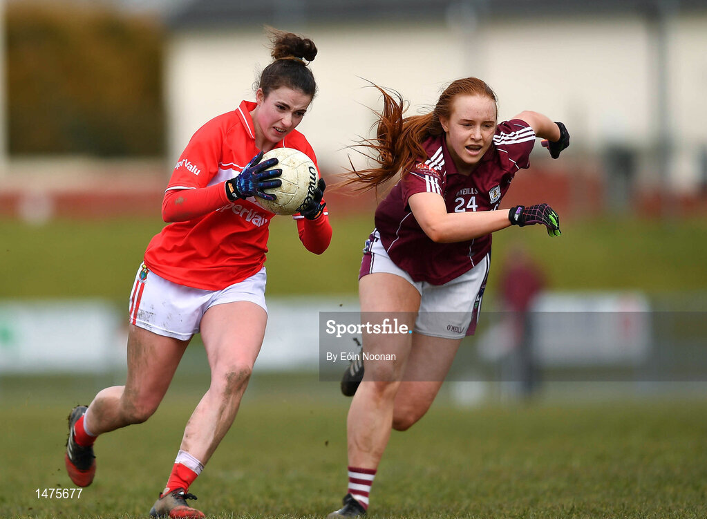 1 April 2018; Shauna Kelly of Cork in action against Siobhan Divilly of Galway during the Lidl Ladies Football National League Division 1 Round 7 match between Galway and Cork at Clonberne GAA Pitch in Ballinasloe, Co Galway. Photo by Eóin Noonan/Sportsfile