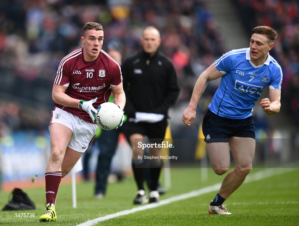 1 April 2018; Eamonn Brannigan of Galway in action against John Small of Dublin during the Allianz Football League Division 1 Final match between Dublin and Galway at Croke Park in Dublin. Photo by Stephen McCarthy/Sportsfile
