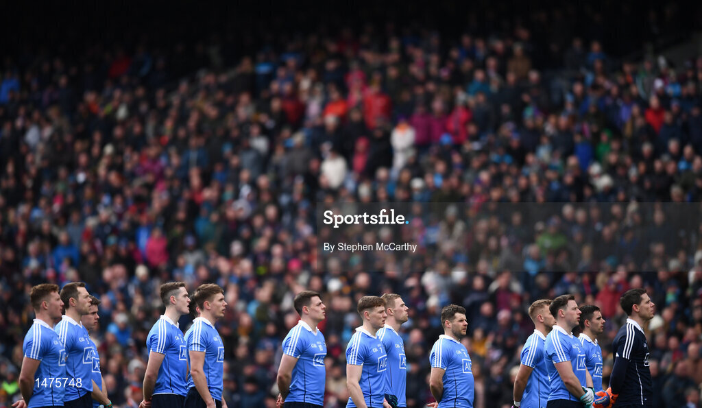 1 April 2018; Dublin players stand for the national anthem prior to the Allianz Football League Division 1 Final match between Dublin and Galway at Croke Park in Dublin. Photo by Stephen McCarthy/Sportsfile