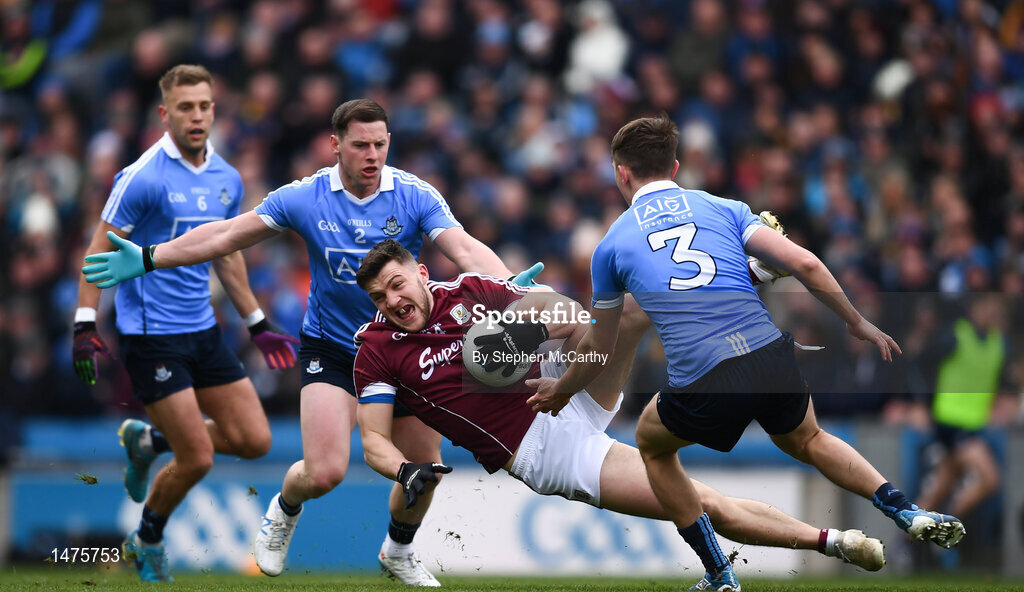 1 April 2018; Damien Comer of Galway in action against Dublin players, from left. Jonny Cooper, Philly McMahon and Michael Fitzsimons during the Allianz Football League Division 1 Final match between Dublin and Galway at Croke Park in Dublin. Photo by Stephen McCarthy/Sportsfile