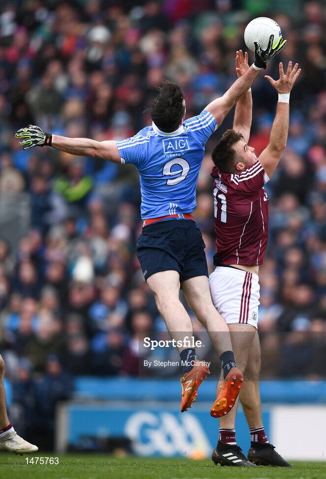 1 April 2018; Michael Darragh Macauley of Dublin in action against Paul Conroy of Galway during the Allianz Football League Division 1 Final match between Dublin and Galway at Croke Park in Dublin. Photo by Stephen McCarthy/Sportsfile