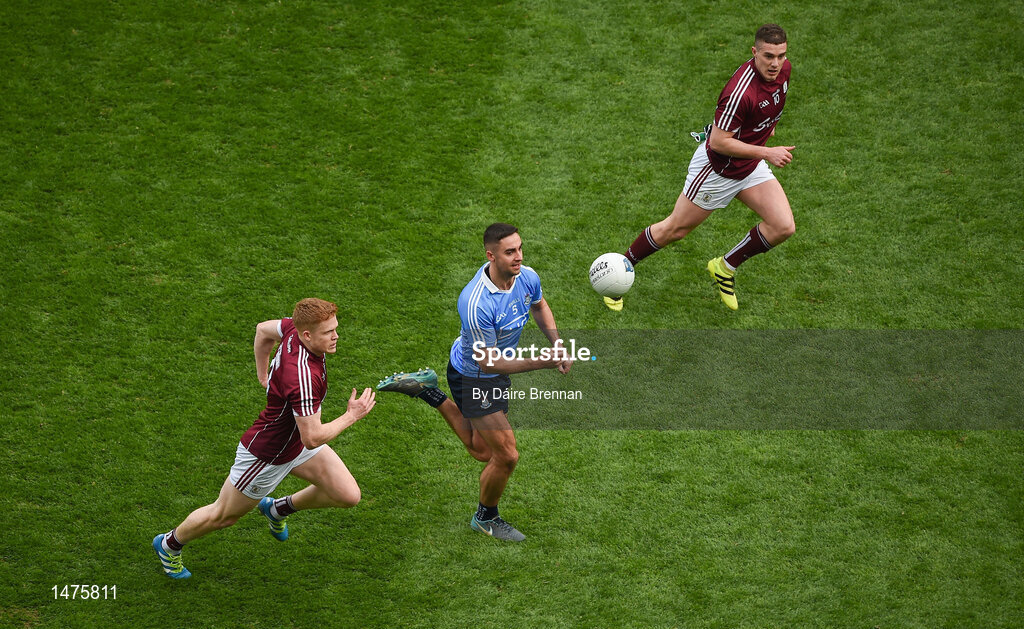 1 April 2018; James McCarthy of Dublin in action against Ciarán Duggan, left, and Eamonn Brannigan of Galway during the Allianz Football League Division 1 Final match between Dublin and Galway at Croke Park in Dublin. Photo by Daire Brennan/Sportsfile
