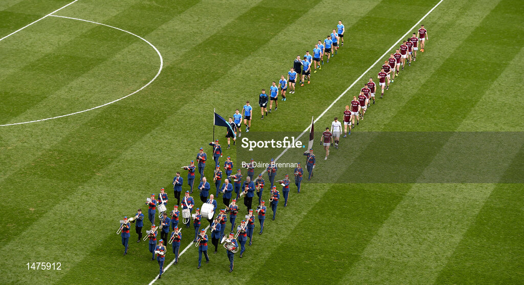 1 April 2018; The Dublin and Galway teams parade behind the Artane School of Music Band ahead of the Allianz Football League Division 1 Final match between Dublin and Galway at Croke Park in Dublin. Photo by Daire Brennan/Sportsfile