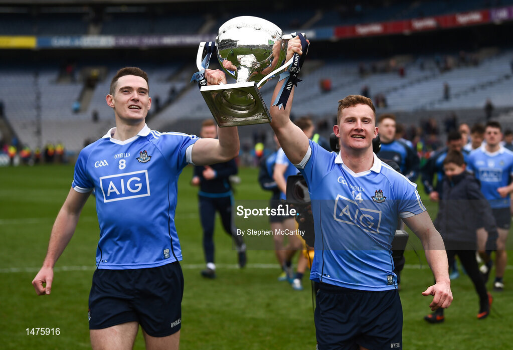 1 April 2018; Ciaran Kilkenny, right, and his Dublin team-mate Brian Fenton celebrate following the Allianz Football League Division 1 Final match between Dublin and Galway at Croke Park in Dublin. Photo by Stephen McCarthy/Sportsfile