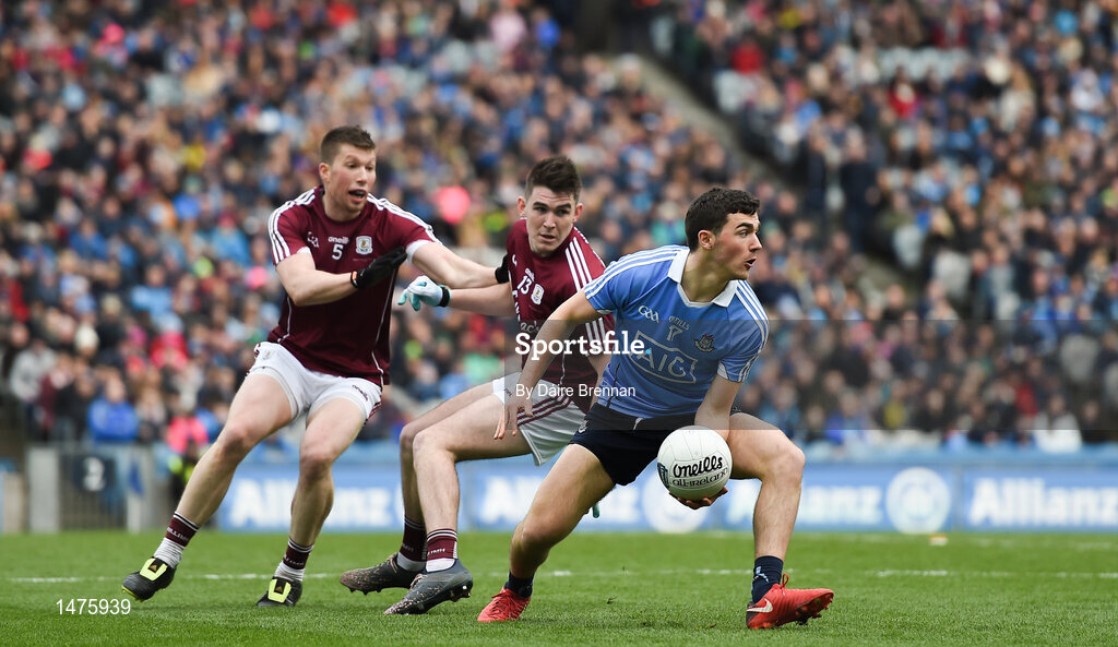 1 April 2018; Colm Basquel of Dublin in action against Gareth Bradshaw, left, and Barry McHugh of Galway during the Allianz Football League Division 1 Final match between Dublin and Galway at Croke Park in Dublin. Photo by Daire Brennan/Sportsfile
