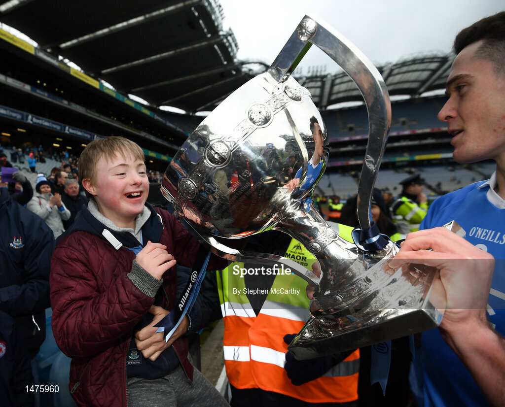 1 April 2018; Mark Butler, age 12, from Raheny, Dublin, has the cup brought to him by Brian Fenton of Dublin following the Allianz Football League Division 1 Final match between Dublin and Galway at Croke Park in Dublin. Photo by Stephen McCarthy/Sportsfile