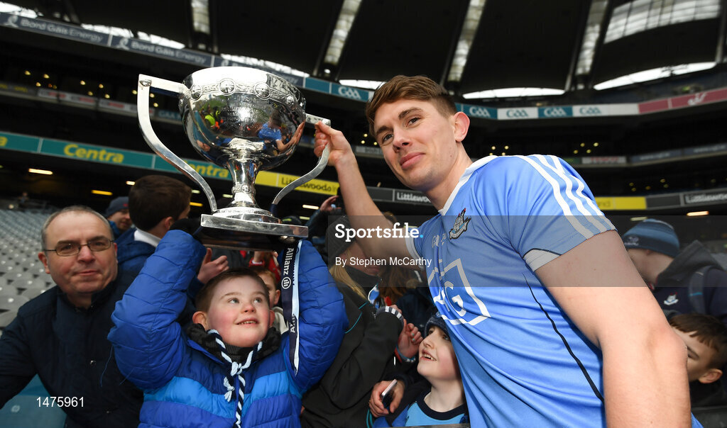 1 April 2018; Daniel McAuley, from Clonsilla, Dublin, lifts the cup with the help of Michael Fitzsimons of Dublin following the Allianz Football League Division 1 Final match between Dublin and Galway at Croke Park in Dublin. Photo by Stephen McCarthy/Sportsfile
