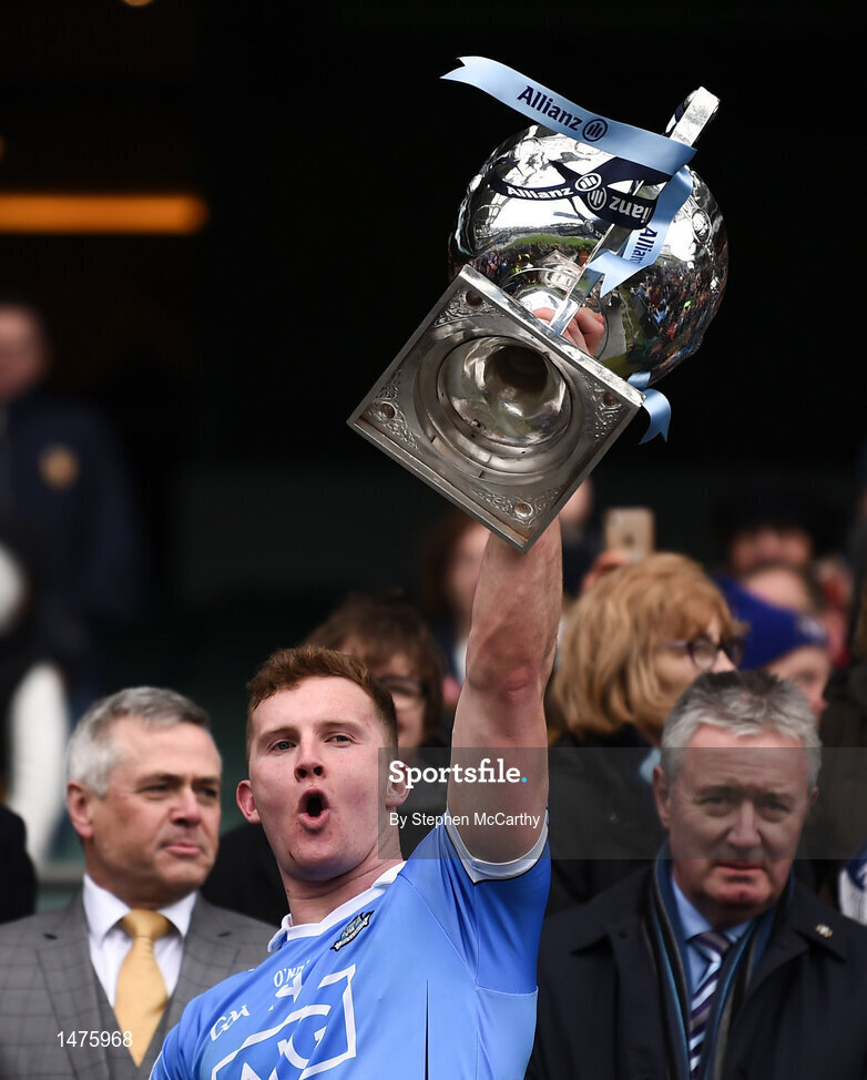 1 April 2018; Ciaran Kilkenny of Dublin lifts the cup following the Allianz Football League Division 1 Final match between Dublin and Galway at Croke Park in Dublin. Photo by Stephen McCarthy/Sportsfile