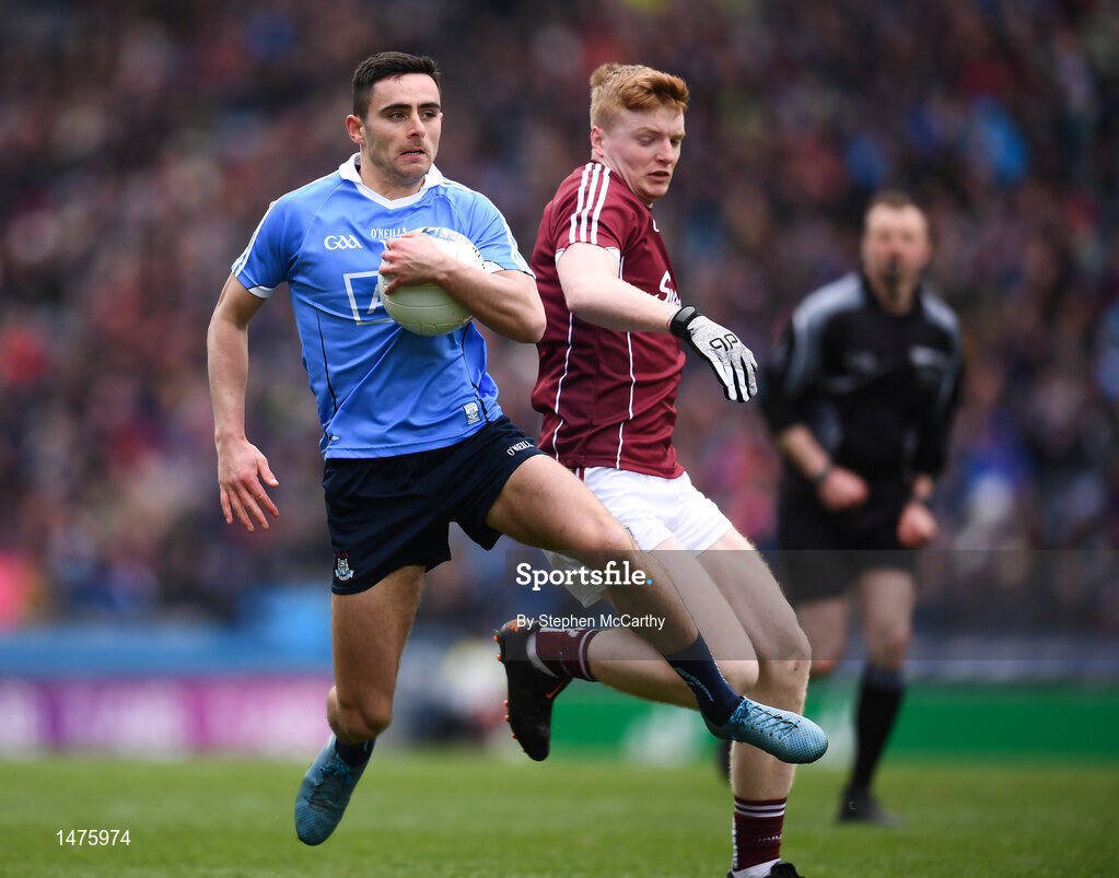 1 April 2018; Niall Scully of Dublin in action against Declan Kyne of Galway during the Allianz Football League Division 1 Final match between Dublin and Galway at Croke Park in Dublin. Photo by Stephen McCarthy/Sportsfile