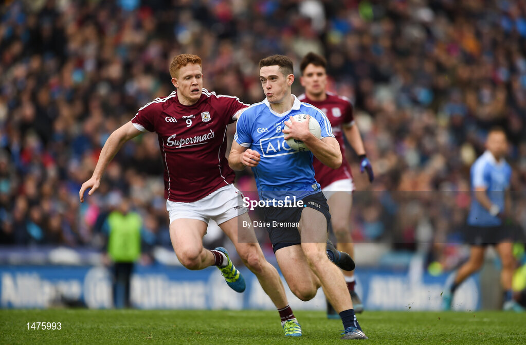1 April 2018; Brian Fenton of Dublin in action against Ciarán Duggan of Galway during the Allianz Football League Division 1 Final match between Dublin and Galway at Croke Park in Dublin. Photo by Daire Brennan/Sportsfile