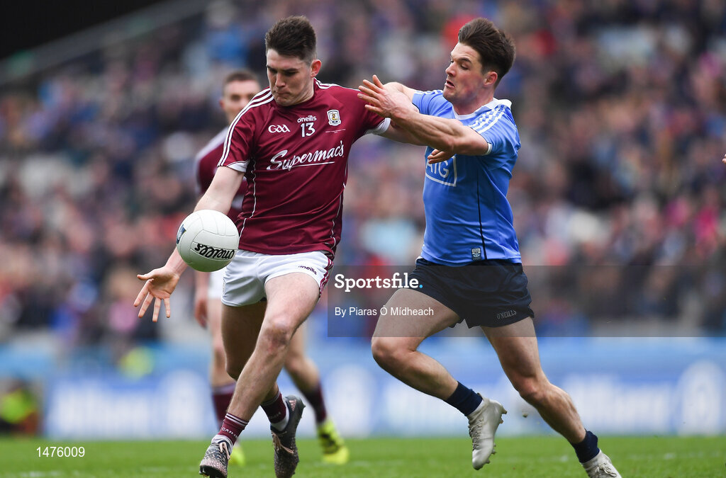 1 April 2018; Barry McHugh of Galway in action against Eric Lowndes of Dublin during the Allianz Football League Division 1 Final match between Dublin and Galway at Croke Park in Dublin. Photo by Piaras Ó Mídheach/Sportsfile