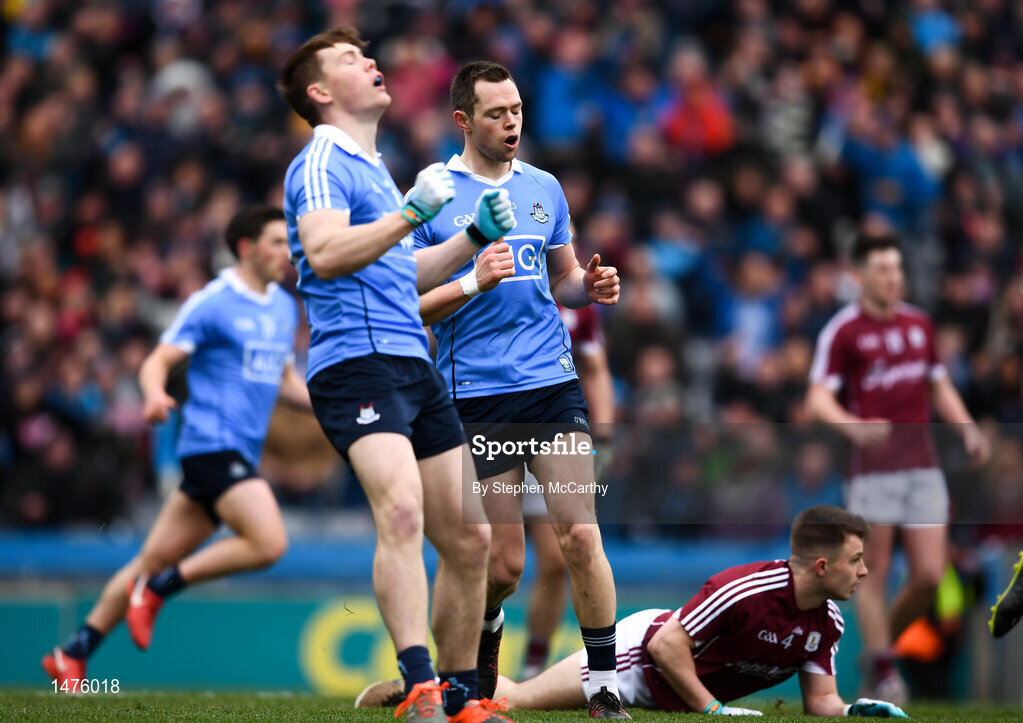 1 April 2018; Dean Rock, right, and his Dublin team-mate Con O'Callaghan react to a missed opportunity during the Allianz Football League Division 1 Final match between Dublin and Galway at Croke Park in Dublin. Photo by Stephen McCarthy/Sportsfile