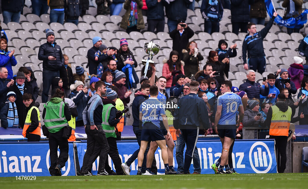 1 April 2018; Brian Fenton of Dublin celebrates with the cup after the Allianz Football League Division 1 Final match between Dublin and Galway at Croke Park in Dublin. Photo by Daire Brennan/Sportsfile