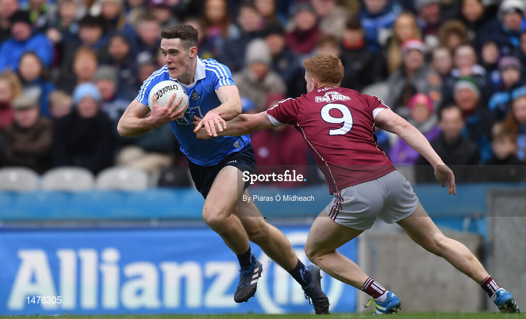 1 April 2018; Brian Fenton of Dublin in action against Ciarán Duggan of Galway during the Allianz Football League Division 1 Final match between Dublin and Galway at Croke Park in Dublin. Photo by Piaras Ó Mídheach/Sportsfile