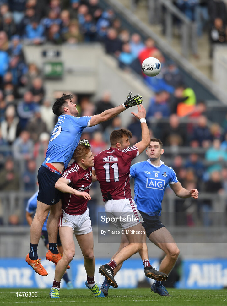 1 April 2018; Michael Darragh Macauley of Dublin, supported by team-mate Brian Fenton, behind, in action against Ciarán Duggan, left, and Paul Conroy of Galway during the Allianz Football League Division 1 Final match between Dublin and Galway at Croke Park in Dublin. Photo by Piaras Ó Mídheach/Sportsfile