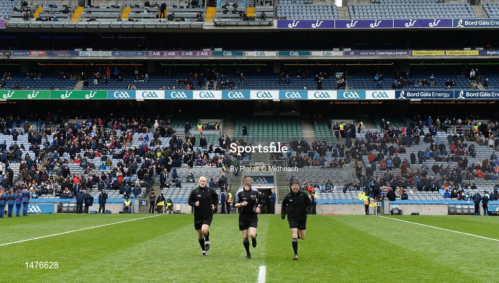 1 April 2018; Referee Anthony Nolan, centre, and his linesmen Conor Lane and James Bermingham, right, warm-up before the Allianz Football League Division 1 Final match between Dublin and Galway at Croke Park in Dublin. Photo by Piaras Ó Mídheach/Sportsfile