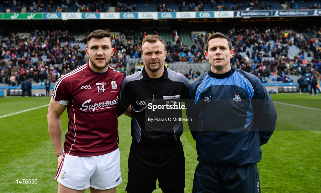 1 April 2018; Referee Anthony Nolan with team captains Damien Comer of Galway and Stephen Cluxton of Dublin before the Allianz Football League Division 1 Final match between Dublin and Galway at Croke Park in Dublin. Photo by Piaras Ó Mídheach/Sportsfile