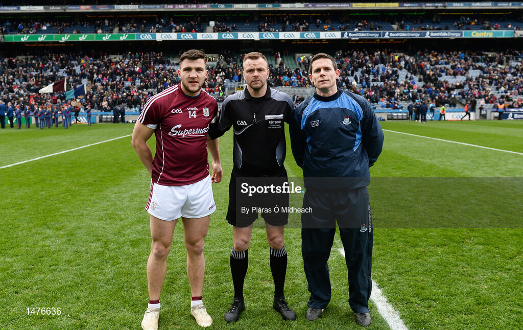 1 April 2018; Referee Anthony Nolan with team captains Damien Comer of Galway and Stephen Cluxton of Dublin before the Allianz Football League Division 1 Final match between Dublin and Galway at Croke Park in Dublin. Photo by Piaras Ó Mídheach/Sportsfile