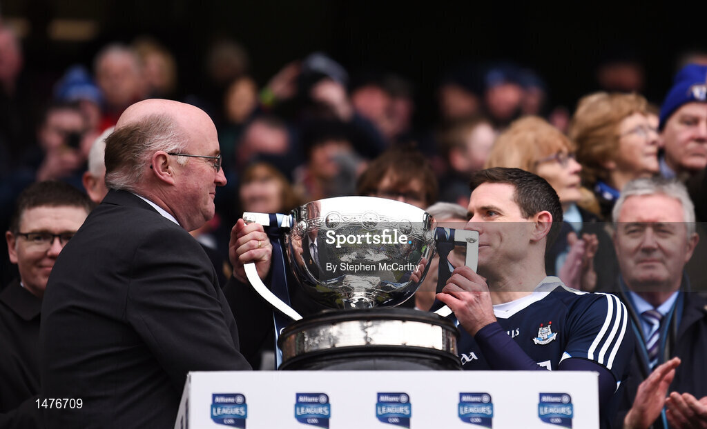 1 April 2018; Uachtarán Chumann Lúthchleas Gael John Horan presents the cup to Dublin captain Stephen Cluxton following the Allianz Football League Division 1 Final match between Dublin and Galway at Croke Park in Dublin. Photo by Stephen McCarthy/Sportsfile