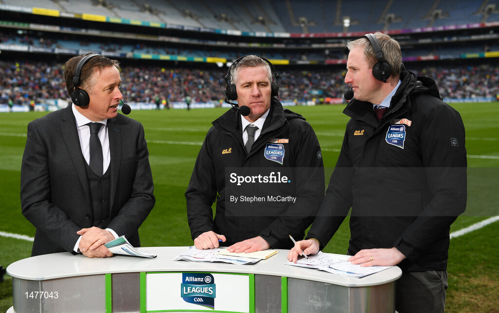 1 April 2018; TG4 presenter Micheál Ó Domhnaill, left, with analysts Seán Óg de Paor and Coman Goggins, right, during the Allianz Football League Division 1 Final match between Dublin and Galway at Croke Park in Dublin. Photo by Stephen McCarthy/Sportsfile