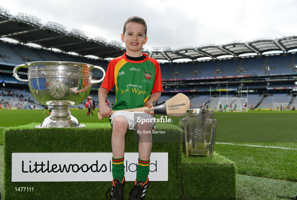3 April 2018; Players from Ballinamere GAA, Co Offaly, pictured with the Sam Maguire and Liam MacCarthy Trophies during Day 1 of the The Go Games Provincial days in partnership with Littlewoods Ireland at Croke Park in Dublin. Photo by Sam Barnes/Sportsfile