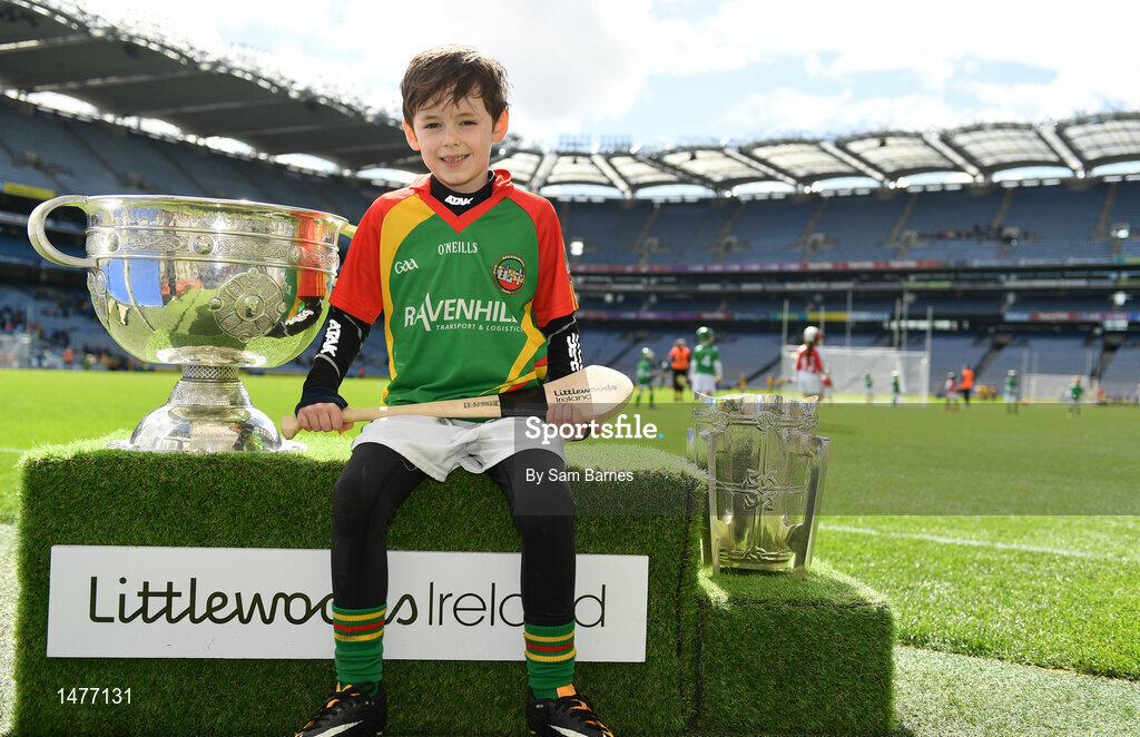 3 April 2018; Players from Ballinamere GAA, Co Offaly, pictured with the Sam Maguire and Liam MacCarthy Trophies during Day 1 of the The Go Games Provincial days in partnership with Littlewoods Ireland at Croke Park in Dublin. Photo by Sam Barnes/Sportsfile