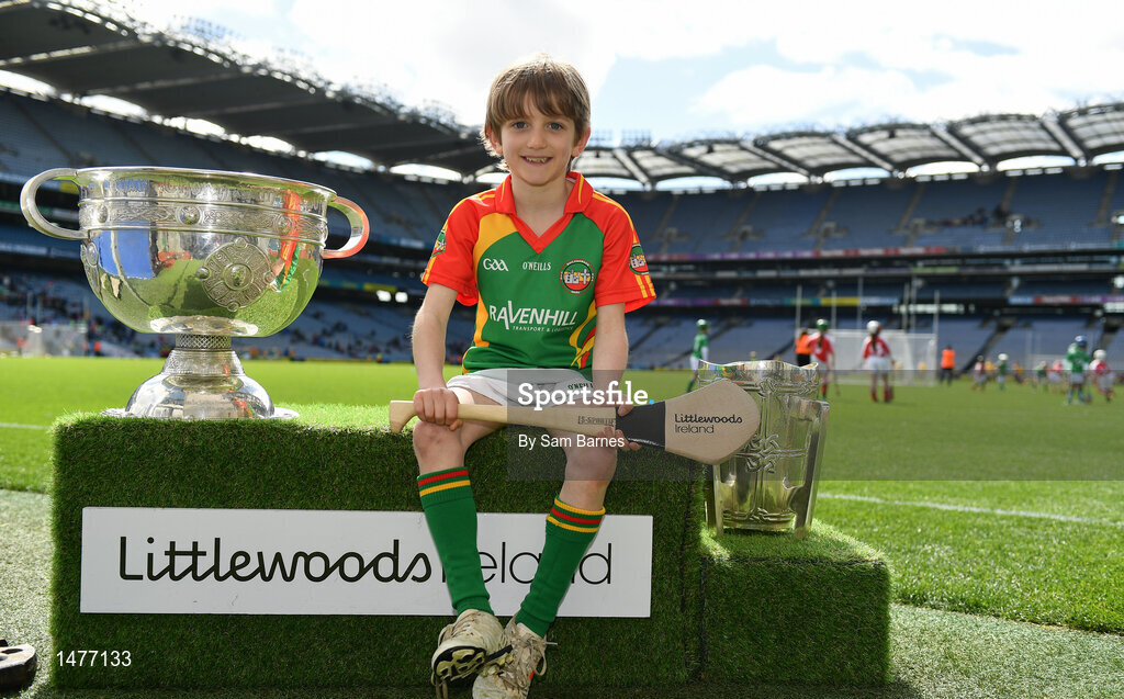 3 April 2018; Players from Ballinamere GAA, Co Offaly, pictured with the Sam Maguire and Liam MacCarthy Trophies during Day 1 of the The Go Games Provincial days in partnership with Littlewoods Ireland at Croke Park in Dublin. Photo by Sam Barnes/Sportsfile