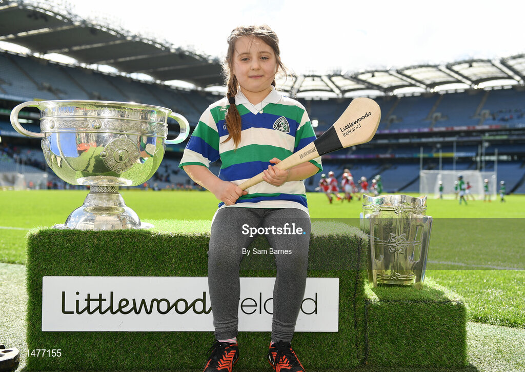 3 April 2018; Players from Carrig/Riverstown Gaels GAA, Co Offaly, pictured with the Sam Maguire and Liam MacCarthy Trophies during Day 1 of the The Go Games Provincial days in partnership with Littlewoods Ireland at Croke Park in Dublin. Photo by Sam Barnes/Sportsfile