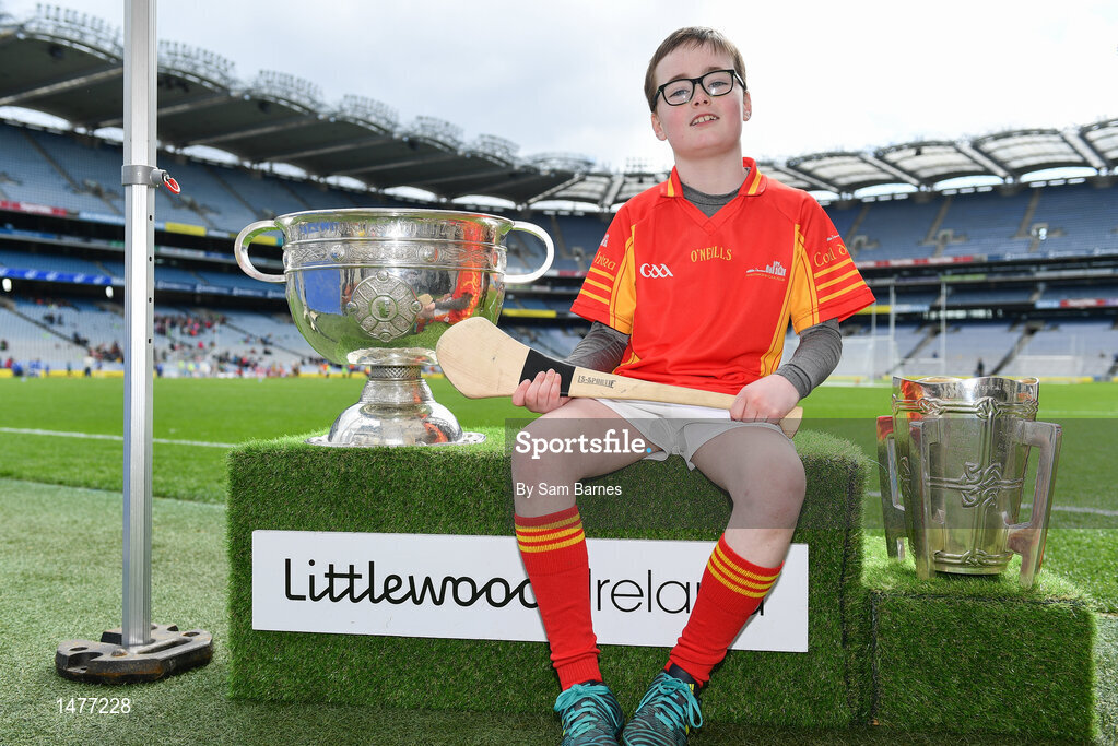 3 April 2018; Players from Horeswood GAA, Co Wexford, pictured with the Sam Maguire and Liam MacCarthy Trophies during Day 1 of the The Go Games Provincial days in partnership with Littlewoods Ireland at Croke Park in Dublin. Photo by Sam Barnes/Sportsfile