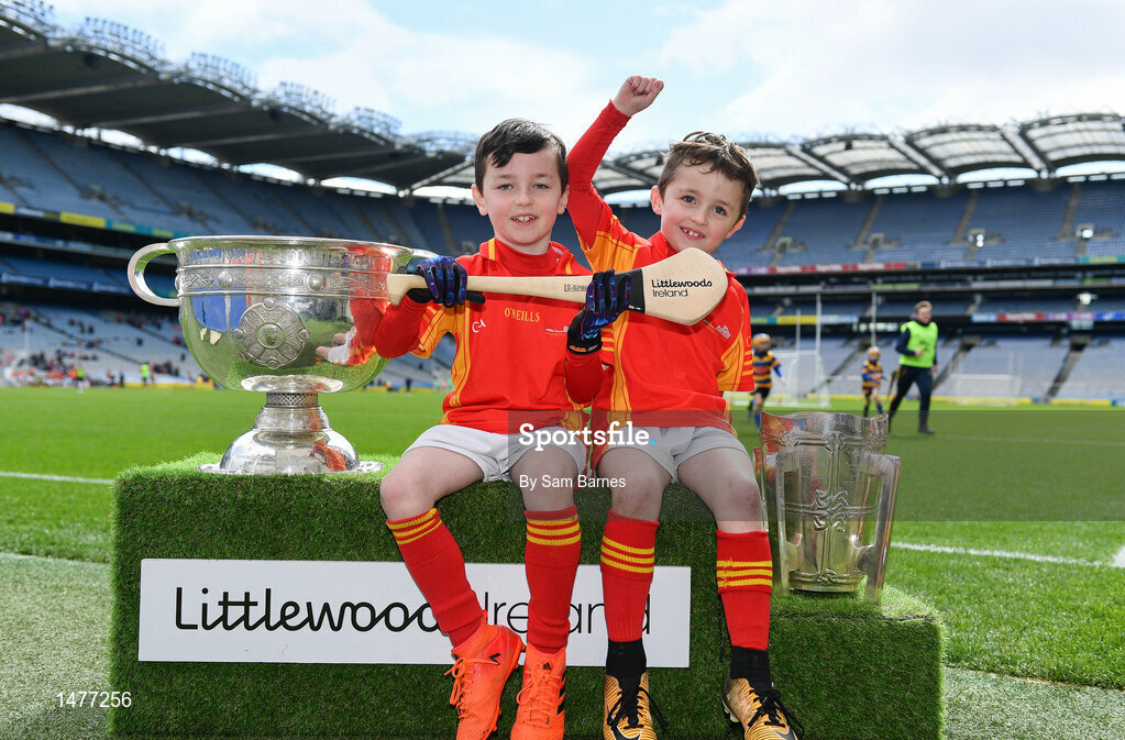 3 April 2018; Players from Horeswood GAA, Co Wexford, pictured with the Sam Maguire and Liam MacCarthy Trophies during Day 1 of the The Go Games Provincial days in partnership with Littlewoods Ireland at Croke Park in Dublin. Photo by Sam Barnes/Sportsfile