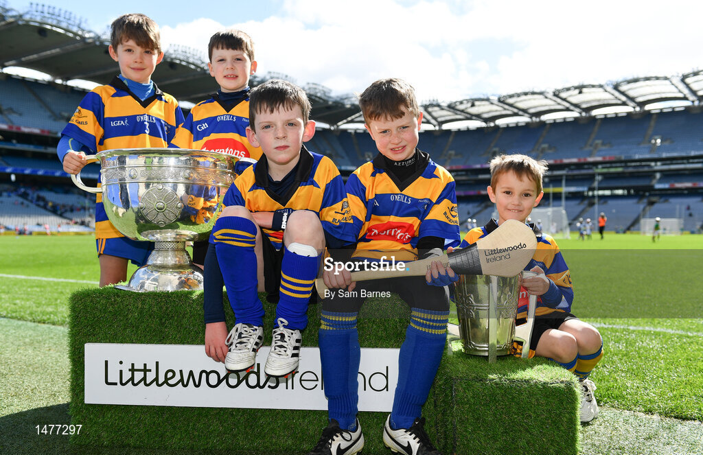 3 April 2018; Players from Blackhall Gaels, Co Meath, pictured with the Sam Maguire and Liam MacCarthy Trophies during Day 1 of the The Go Games Provincial days in partnership with Littlewoods Ireland at Croke Park in Dublin. Photo by Sam Barnes/Sportsfile