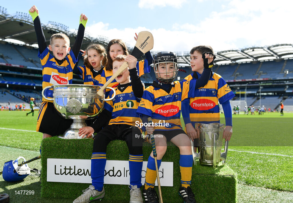 3 April 2018; Players from Blackhall Gaels, Co Meath, pictured with the Sam Maguire and Liam MacCarthy Trophies during Day 1 of the The Go Games Provincial days in partnership with Littlewoods Ireland at Croke Park in Dublin. Photo by Sam Barnes/Sportsfile