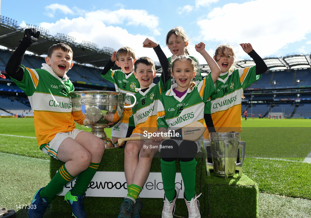 3 April 2018; Players from Crettyard GAA, Co Laois, pictured with the Sam Maguire and Liam MacCarthy Trophies during Day 1 of the The Go Games Provincial days in partnership with Littlewoods Ireland at Croke Park in Dublin. Photo by Sam Barnes/Sportsfile