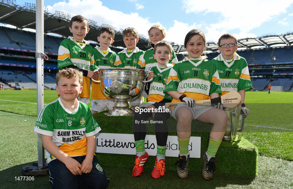 3 April 2018; Players from Crettyard GAA, Co Laois, pictured with the Sam Maguire and Liam MacCarthy Trophies during Day 1 of the The Go Games Provincial days in partnership with Littlewoods Ireland at Croke Park in Dublin. Photo by Sam Barnes/Sportsfile