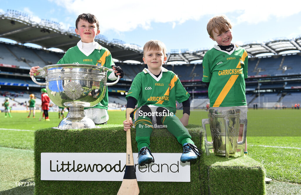 3 April 2018; Players from Carrickshock GAA, Co Kilkenny, pictured with the Sam Maguire and Liam MacCarthy Trophies during Day 1 of the The Go Games Provincial days in partnership with Littlewoods Ireland at Croke Park in Dublin. Photo by Sam Barnes/Sportsfile