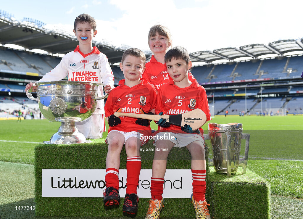 3 April 2018; Players from Timahoe GAA, Co Laois, pictured with the Sam Maguire and Liam MacCarthy Trophies during Day 1 of the The Go Games Provincial days in partnership with Littlewoods Ireland at Croke Park in Dublin. Photo by Sam Barnes/Sportsfile