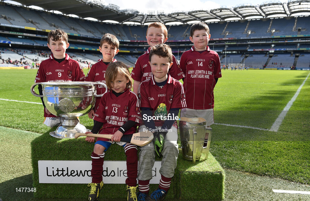 3 April 2018; Players from Multyfarnham GAA, Co Westmeath, pictured with the Sam Maguire and Liam MacCarthy Trophies during Day 1 of the The Go Games Provincial days in partnership with Littlewoods Ireland at Croke Park in Dublin. Photo by Sam Barnes/Sportsfile