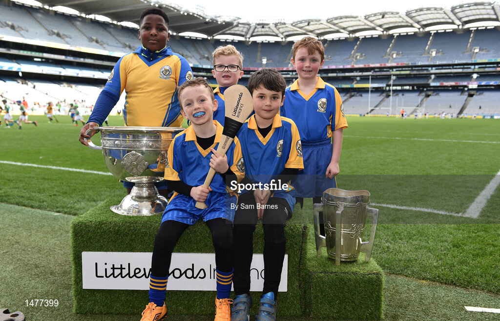 3 April 2018; Players from Wolfetones GAA in Drogheda, Co Louth, pictured with the Sam Maguire and Liam MacCarthy Trophies during Day 1 of the The Go Games Provincial days in partnership with Littlewoods Ireland at Croke Park in Dublin. Photo by Sam Barnes/Sportsfile