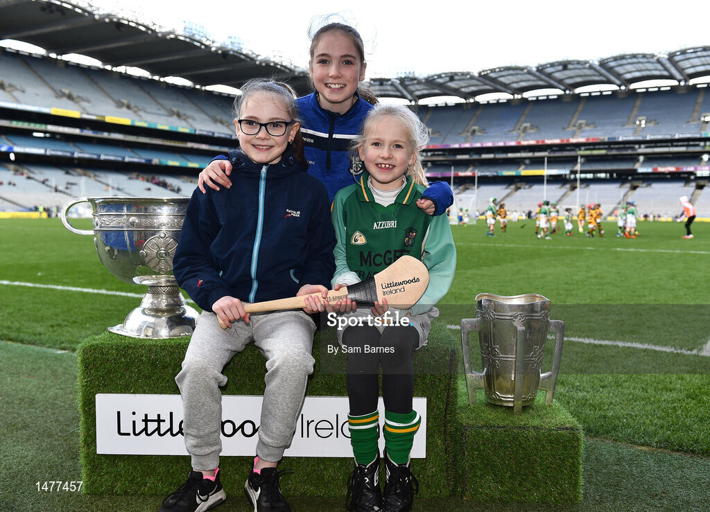 3 April 2018; Players from Naomh Fionnbarra GAA, CO Louth, pictured with the Sam Maguire and Liam MacCarthy Trophies during Day 1 of the The Go Games Provincial days in partnership with Littlewoods Ireland at Croke Park in Dublin. Photo by Sam Barnes/Sportsfile