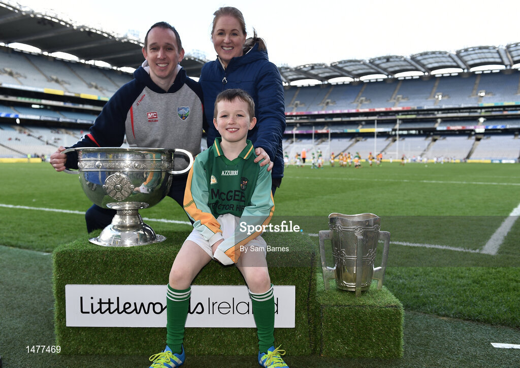 3 April 2018; Players from Naomh Fionnbarra GAA, CO Louth, pictured with the Sam Maguire and Liam MacCarthy Trophies during Day 1 of the The Go Games Provincial days in partnership with Littlewoods Ireland at Croke Park in Dublin. Photo by Sam Barnes/Sportsfile