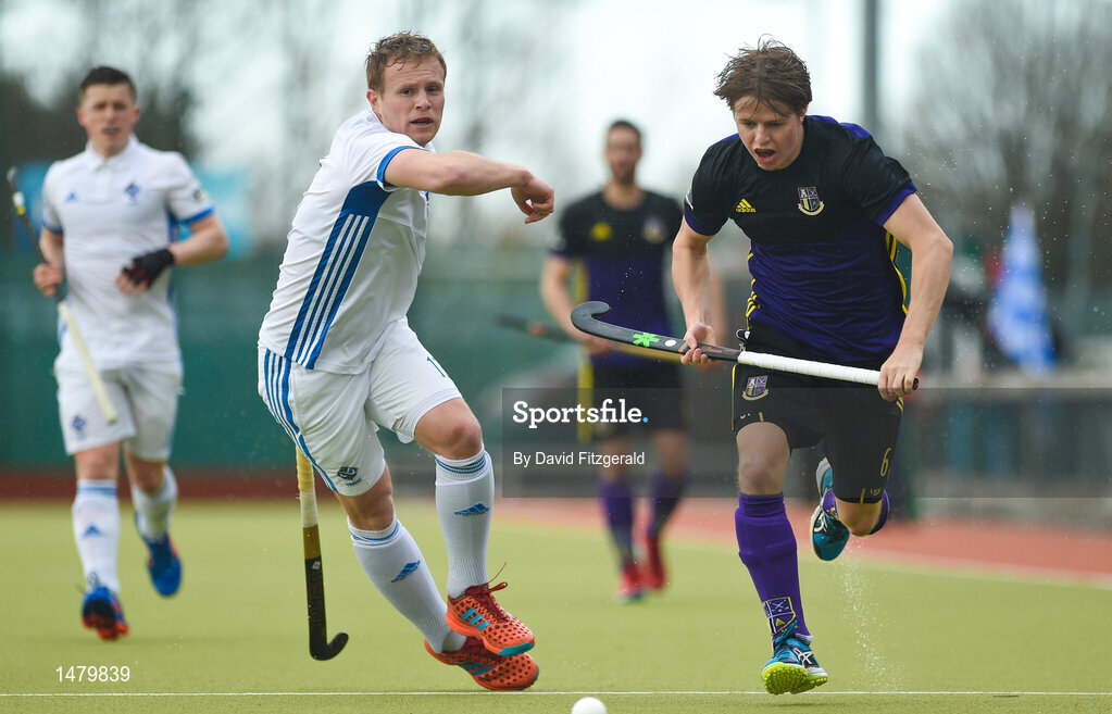 8 April 2018; Kirk Shimmins of Pembroke Wanderers in action against Luke Madeley of Three Rock Rovers during the Men's Irish Senior Cup Final match between Three Rock Rovers and Pembroke Wanderers at the National Hockey Stadium in UCD, Dublin. Photo by David Fitzgerald/Sportsfile