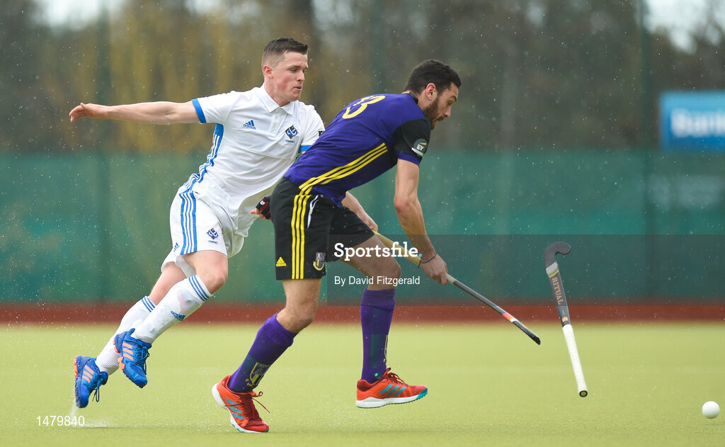 8 April 2018; Cedric Mushiete of Pembroke Wanderers in action against John Mullins of Three Rock Rovers during the Men's Irish Senior Cup Final match between Three Rock Rovers and Pembroke Wanderers at the National Hockey Stadium in UCD, Dublin. Photo by David Fitzgerald/Sportsfile