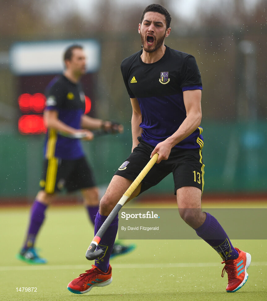 8 April 2018; Cedric Mushiete of Pembroke Wanderers reacts to a decision during the Men's Irish Senior Cup Final match between Three Rock Rovers and Pembroke Wanderers at the National Hockey Stadium in UCD, Dublin. Photo by David Fitzgerald/Sportsfile