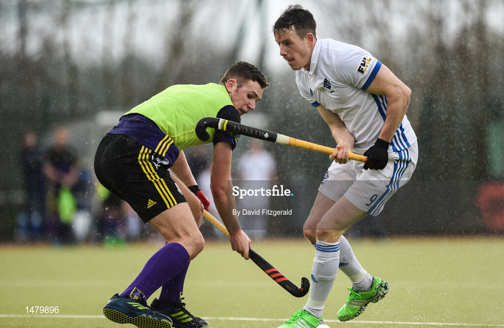 8 April 2018; Ross Canning of Three Rock Rovers in action against Keith O'Hare of Pembroke Wanderers during the Men's Irish Senior Cup Final match between Three Rock Rovers and Pembroke Wanderers at the National Hockey Stadium in UCD, Dublin. Photo by David Fitzgerald/Sportsfile