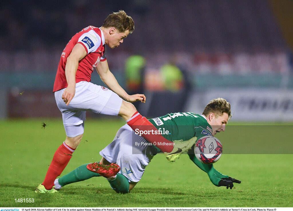 13 April 2018; Kieran Sadlier of Cork City in action against Simon Madden of St Patrick's Athletic during SSE Airtricity League Premier Division match between Cork City and St Patrick's Athletic at Turner's Cross in Cork. Photo by Piaras Ó Mídheach/Sportsfile